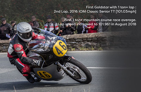 Phil's list of achievements in racing is exemplary. With awards including Manx Grand Prix winner 2010 with a massive lead and a lap record that stand to this day in the Ultra-lightweight category. He was First Privateer in 2015,16 & 17 on a 350 Drixton Honda and his Goldstar was the first Goldie to complete not only a lap, but the circuit with a speed in excess of 100mph… something that the Goldstar owners club really appreciated.